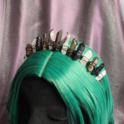 ☽ The Ahmanet Crown features black, white and smokey quartz wire wrapped onto a headband with a filigree moon. With three variations of one of the most powerful stones, this is fit for any special occasion or event ☾