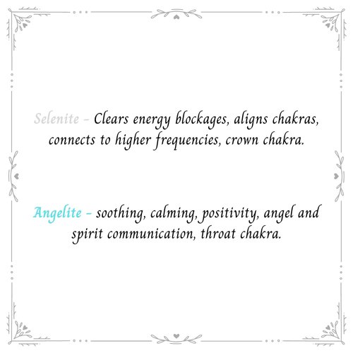 • Angelite - soothing, calming, positivity, healing, angel and spirit communication, third eye and throat chakras.