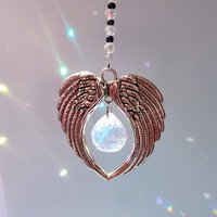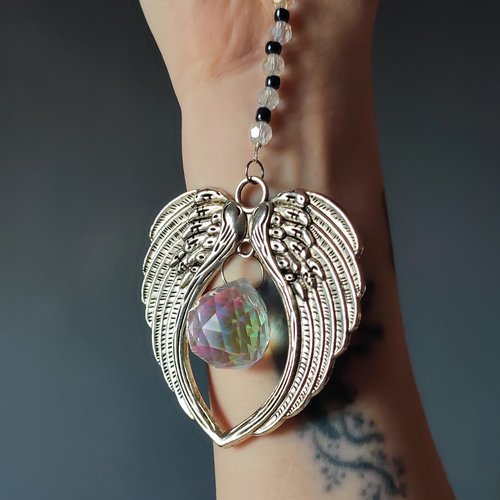 ☽ Handmade suncatcher featuring a glass sphere between two silver angel wings, adorned with blue beads and Austrian crystals. An adjustable chain with clasp makes this convenient for hanging and it also comes with a free split ring attachment ☾