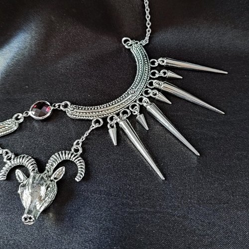 ☽ Bib-style necklace/chest piece with Tibetan silver connectors joined to a central red gem, adorned with acrylic spikes and hanging Baphomet head. Stainless steel chain measures 11 inches with a 2 inch adjustment chain. Perfect accessory for alternative styles such as gothic, punk, wiccan, pagan and the occult ☾