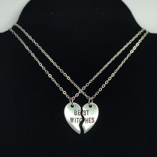 ☽ "BEST WITCHES" heart-shaped silver pendant with 18 inch stainless steel chain or waxed cotton cord. Pendants are zinc alloy and each half measures 19mm x 10mm. Presented in an organza bag ☾