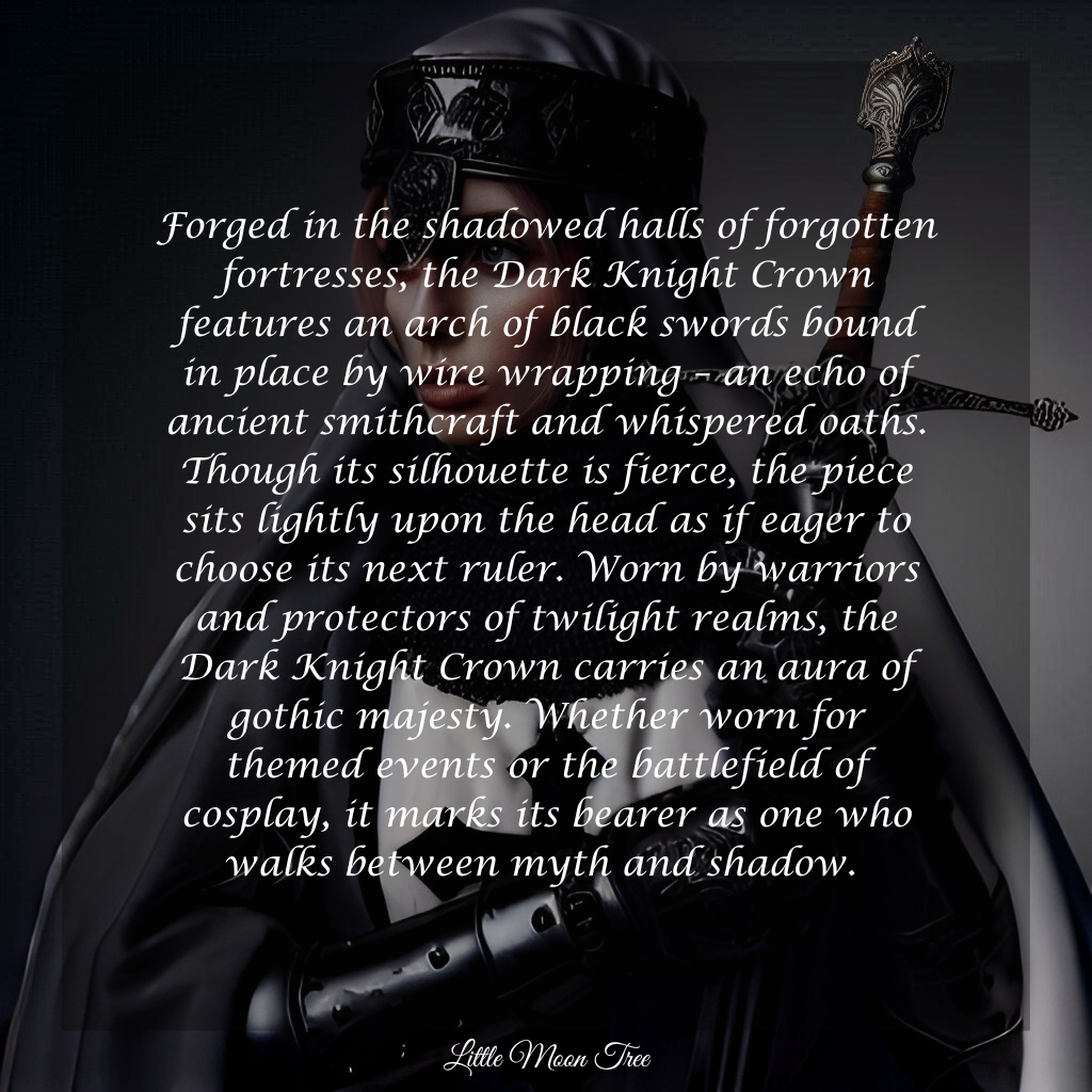 ☽ The Dark Knight Crown is a relic of forgotten fortresses, featuring an arch of black swords bound in place by wire wrapping - an echo of ancient smithcraft and whispered oaths. Though its silhouette is fierce, the piece sits lightly upon the head as if eager to choose its next ruler. Worn by warriors and protectors of twilight realms, the Dark Knight Crown carries an aura of gothic majesty. Whether worn for themed events or the battlefield of cosplay, it marks the bearer as one who walks between myth and shadow ☾