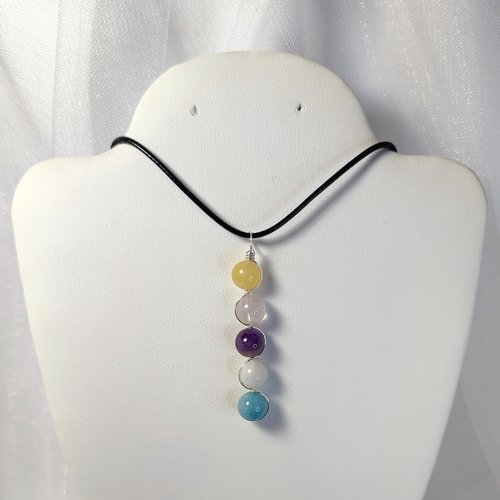 ☽ Gemstone pendant for depression with five beads wrapped in silver plated wire. Beads include citrine, rose quartz, amethyst, rainbow moonstone, aquamarine and measure approximately 7mm-8mm each. Comes with an 18 inch stainless steel chain or waxed cotton cord and presented in an organza bag with information card ☾
