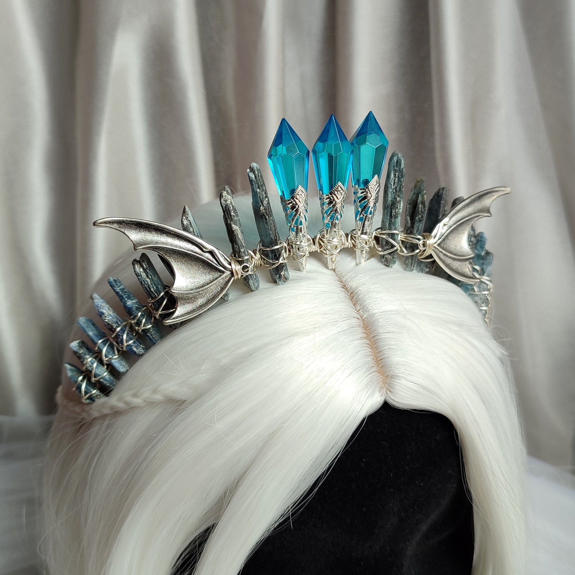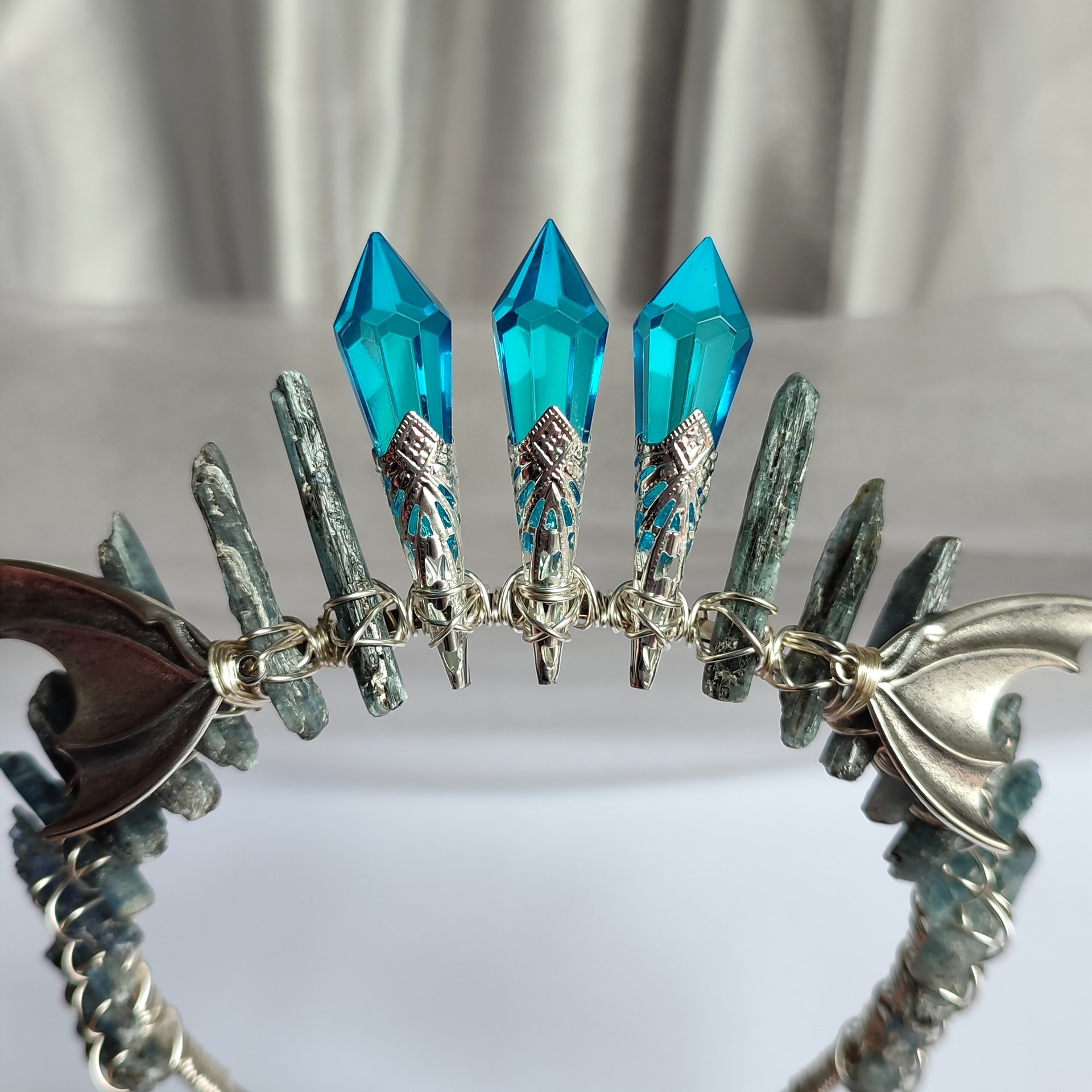 ☽ The Dragon Queen Crown is a wearable piece of art that could have emerged straight from the pages of a fantasy epic, featuring natural raw kyanite wire wrapped onto a headband. Complementing the stones in a sparkling centrepiece are blue glass crystals, reminiscent of the clear skies of a dragon's domain. Silver wings symbolise freedom and the soaring spirit of the dragon queen, adding an element of power and grace to the design. This crown is an enchanted artifact that transports the wearer into a rich fantasy world of fire-breathing dragons, princesses and princes; elves and fae folk. It's perfect for cosplay, fancy dress and other themed events where you want to stand out as royalty from a mythical realm. Embrace you inner fantasy and step into a story of your own making ☾