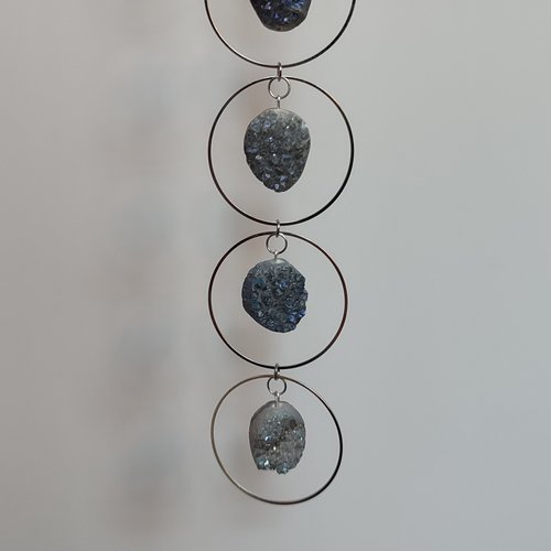 ☽ Handmade suncatcher featuring grey/blue druzy quartz clusters in silver rings that glisten and sparkle when catching the light. An adjustable chain with clasp makes this convenient for hanging and it also comes with a free split ring attachment ☾