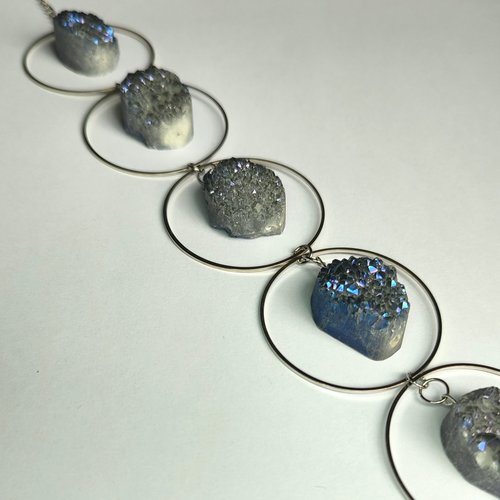 Materials: druzy titanium quartz, plated brass, stainless steel.