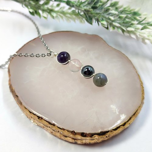 ☽ Pendant for empaths and protection against negativity with four gemstone beads wrapped in silver plated wire. Beads include amethyst, rose quartz, hematite, labradorite and measure approximately 7mm-8mm each. Comes with an 18 inch stainless steel chain or waxed cotton cord and presented in an organza bag with information card ☾