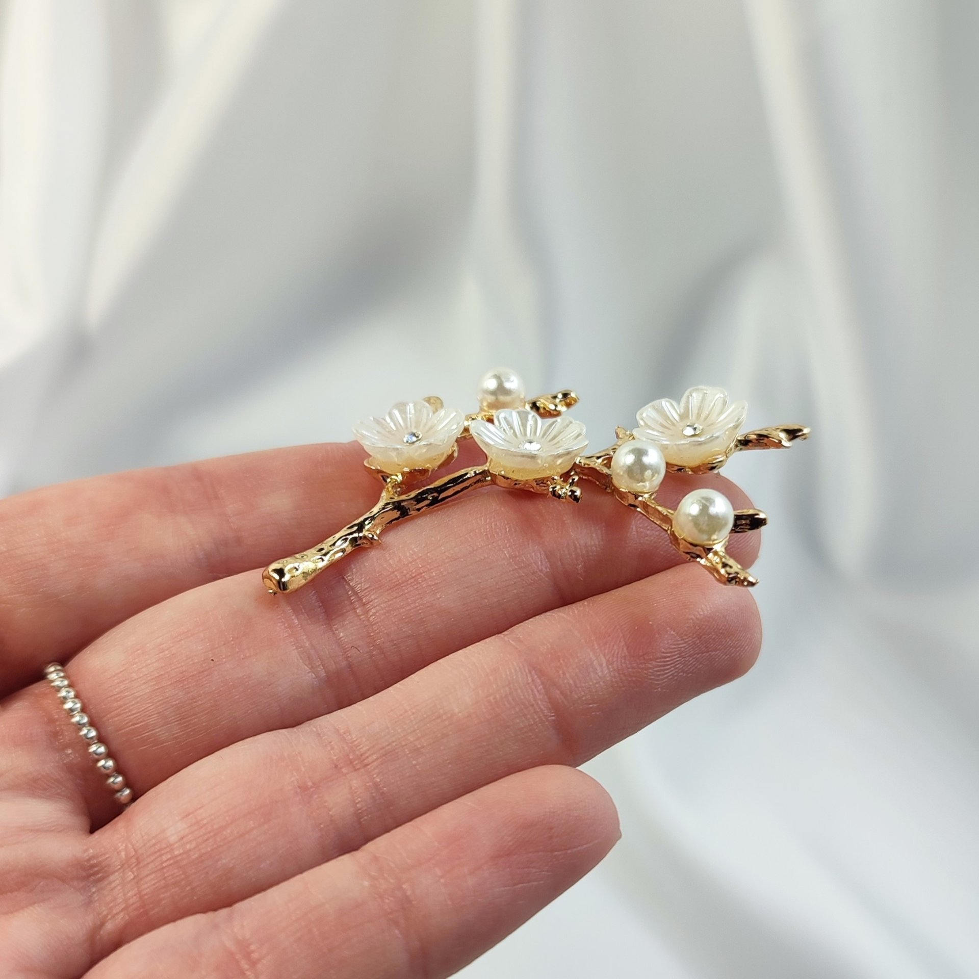 Pack of 2 gold branches with flowers and faux pearl beads. These are ideal for making jewellery, accessories and other crafts.