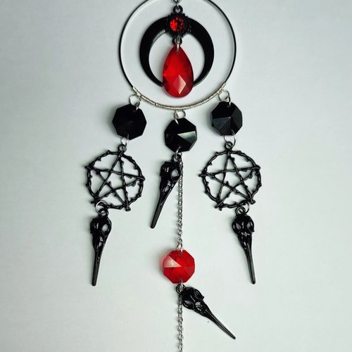 ☽ Handmade suncatcher featuring a bat, central moon and ring with extending pentacles and crow skulls; adorned with black and red glass crystals. An adjustable chain with clasp makes this convenient for hanging and it also comes with a free split ring attachment ☾