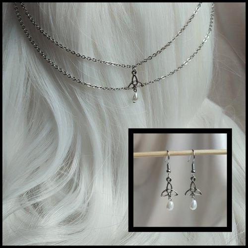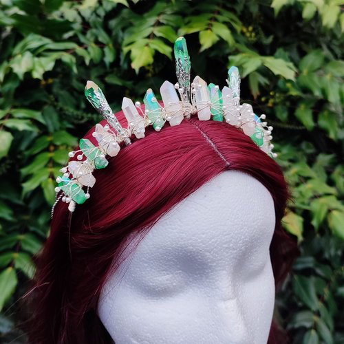 ☽ The Green Spirit Crown captures the essence of nature with green titanium quartz and iridescent angel aura quartz, with ethereal hues of blues, soft pinks and gold that shift like the seasons. The addition of faux pearl beads nestled amongst the stones like dewy blossoms adds a touch of elven elegance, bestowing grace upon the wearer. Elements are intricately wrapped onto a headband with silver wire, and for added versatility, the crown comes with an optional double head chain featuring a Celtic trinity knot and pearl suspended like a moonlit tear. This enchanting piece is ideal for forest-dwelling nymphs, fairy brides and woodland weddings. It's not just an accessory - it's a portal to nature's realm where magic thrives! ☾