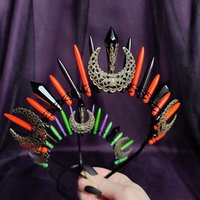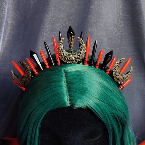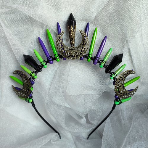 ☽ Introducing the Halloween Queen Crown, a mesmerising fusion of howlite, black glass crystals and bronze moons intricately wire wrapped onto a headband. This enchanting accessory offers two spellbinding styles: "Pumpkin" with its haunting blend of black and orange stones; and "Casper", a ghostly vision of purple and green. Become the ruler of all things spooky, perfect for bewitching fancy dress parties and themed events. Embrace your inner enchantress and let the Halloween Queen Crown cast its spell ☾