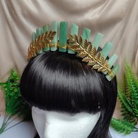 ☽ The Hera Crown is a tribute to divine femininity that draws inspiration from the queen of the Greek gods, Hera. Each piece of green aventurine has been chosen for its vibrant hue and natural charm, representing the abundance of the earth; with accompanying gold accents to embody the sun's eternal glow and provide a regal aesthetic. Twin laurel leaf branches evoke the Greek tradition of crowning victors and scholars, signifying triumph and wisdom. The Hera Crown is an ancient myth brought to life, designed to invoke the goddess's attributes of power, marriage and guardianship over women. To wear this piece is to carry the legacy of Hera herself and a declaration of one's own divine nature. It's an emblem of power and grace for anyone looking to make a statement at their next special event ☾