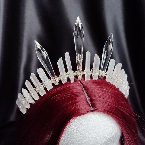 ☽ The Ice Queen Crown features delicate glass crystals gazing to the heavens like faceted icicles reflecting the winter sky. Set amongst them are quartz shards, their milky translucence reminiscent of frozen breath. Silver wire weaves around the stones like moon-kissed threads, while crystals shimmer with an ethereal beauty, as if carved from the deepest ice caves. The Ice Queen Crown transforms the wearer into a cosplay queen ruling over crystalline realms; it graces the heads of winter wonderland brides as they dance beneath snowflake confetti. This isn't just an accessory - it's a portal to an enchanted, frozen forest ☾