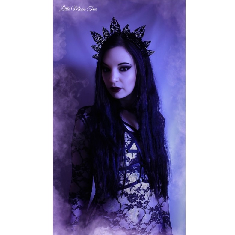 ☽ The Luna Halo weaves shadows into adornment with black filigree teardrops spun onto a headband, their delicate lace-like patterns evoking secret incantations. Silver crescent moons infuse the piece with lunar energy so that when worn, it becomes a bridge to the Otherworld. This is designed to be lightweight, perfect for a gothic goddess to cast her magic and dance in the moonlight. Festivals and events become enchanted realms where night dwellers, vampire brides and werewolf queens embrace the beauty of darkness. Whether you're attending a masquerade ball, midnight gathering or seeking to channel your inner witch, the Luna Halo awaits ☾