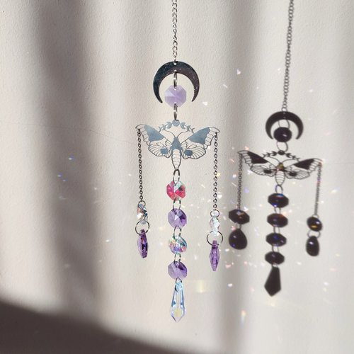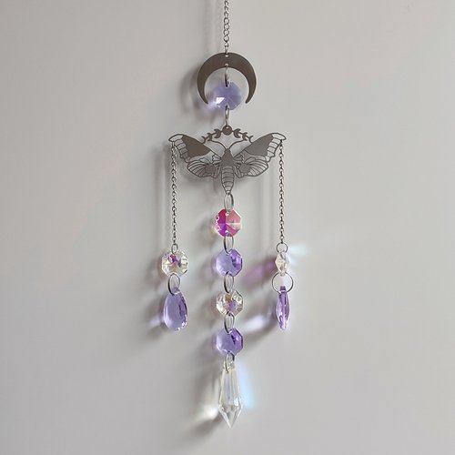 ☽ Handmade suncatcher featuring a silver moth and crescent moon with purple and AB crystals that create a stunning rainbow effect when catching the light. An adjustable chain with clasp makes this convenient for hanging and it also comes with a free split ring attachment ☾
