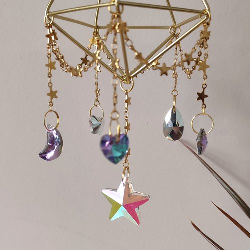 ☽ Geometric air plant holder decorated with gold stair chain and glass crystals. Crystals include a heart, moon, star, butterfly, flower and teardrop in purple, blue and pink hues with a large central AB star. Comes with twine for hanging and can be used to display air plants, flowers, crystals and more ☾
