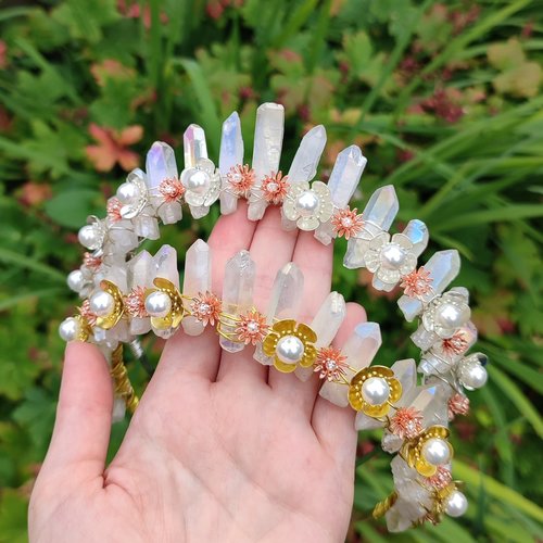☽ Step into the realm of fairytales and grace with the Ophelia Crown, a piece that captures ethereal elegance for enchanted moments. Angel aura quartz shimmers with a gentle rainbow-like lustre, reminiscent of the morning sky kissed at first light. Each delicately-placed metal flower cradles faux pearl beads, their intricate details whispering tales of mystical gardens. For a touch of moonlit charm, the silver finish reflects the stars' twinkles on a summer night; and gold offers a warm, sun-drenched allure. Transform any event into a magical celebration, from fantasy balls to wedding ceremonies. The Ophelia Crown is the perfect accessory for a fairy princess on her special day ☾
