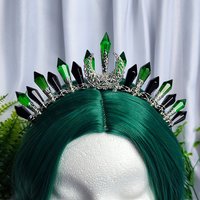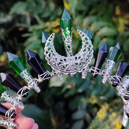 ☽ Combining nature's magic with gothic enchantment, The Poison Ivy Crown could be a creation that sprung from the deepest, darkest forests. Emerald-green glass crystals hold secrets from centuries past, their facets catching the light like dewdrops on leaves; nestled in webs of intricate filigree bead caps. Arranged with black crystals that capture the essence of the night, mysterious and alluring; all weaved together using silver wire that flows with the dance of the moonbeams. For an ethereal touch, a central crescent moon stands as a portal to other realms. For the dark fairies, the woodland enchantresses and the vampire queens, wear it boldly and let its magic weave through your hair like moonlight through leaves. The Poison Ivy Crown brings gothic beauty to any event or style ☾