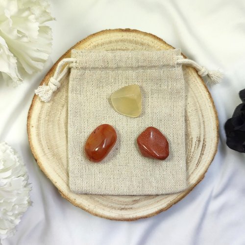 ☽ Set of three tumblestones for clearing and activating the sacral chakra. Includes goldstone, carnelian, moonstone and information card. Crystals measure approximately 20mm-30mm and are presented in a cotton bag ☾