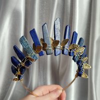 ☽ The Theia Crown is a rich and stylish treasure that whispers tales of ancient wisdom and celestial power. Deep blue lapis lazuli stands as fragments of the midnight sky, meticulously weaved onto a headband with gold leaves to create a stunning contrast against the stone's profound hues. They are symbols of enlightenment, each coil a pathway to hidden knowledge and truth. The Theia Crown is a beacon for those who seek to channel their inner deity - for the queens, kings, goddesses and gods of our modern mythos. Whether you're attending a grand event, masquerade ball or simply want to embrace your royal nature in your own mythical realm, let it adorn you with beauty and grace ☾